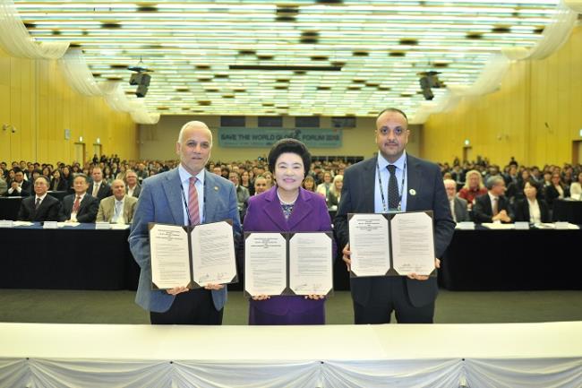 인천 송도컨벤시아에서 열린 '2018 세이브더월드 국제포럼'에서 국제위러브유 장길자 회장(가운데)과 요르단하심자선기구(JHCO) 아이만 리야드 알무플레 사무총장(왼쪽), 이라크연합의료협회(UIMS) 아흐메드 무슈리프 압둘하미드 회장(오른쪽)이 인도주의적 지원 협력을 위한 양해각서(MOU) 체결 후 기념촬영을 하고 있다.