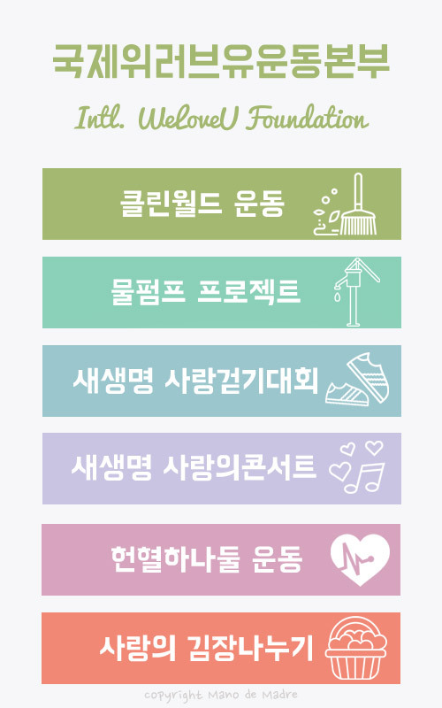 클린월드운동, 물펌프 지원, 헌혈하나둘 운동까지~~
