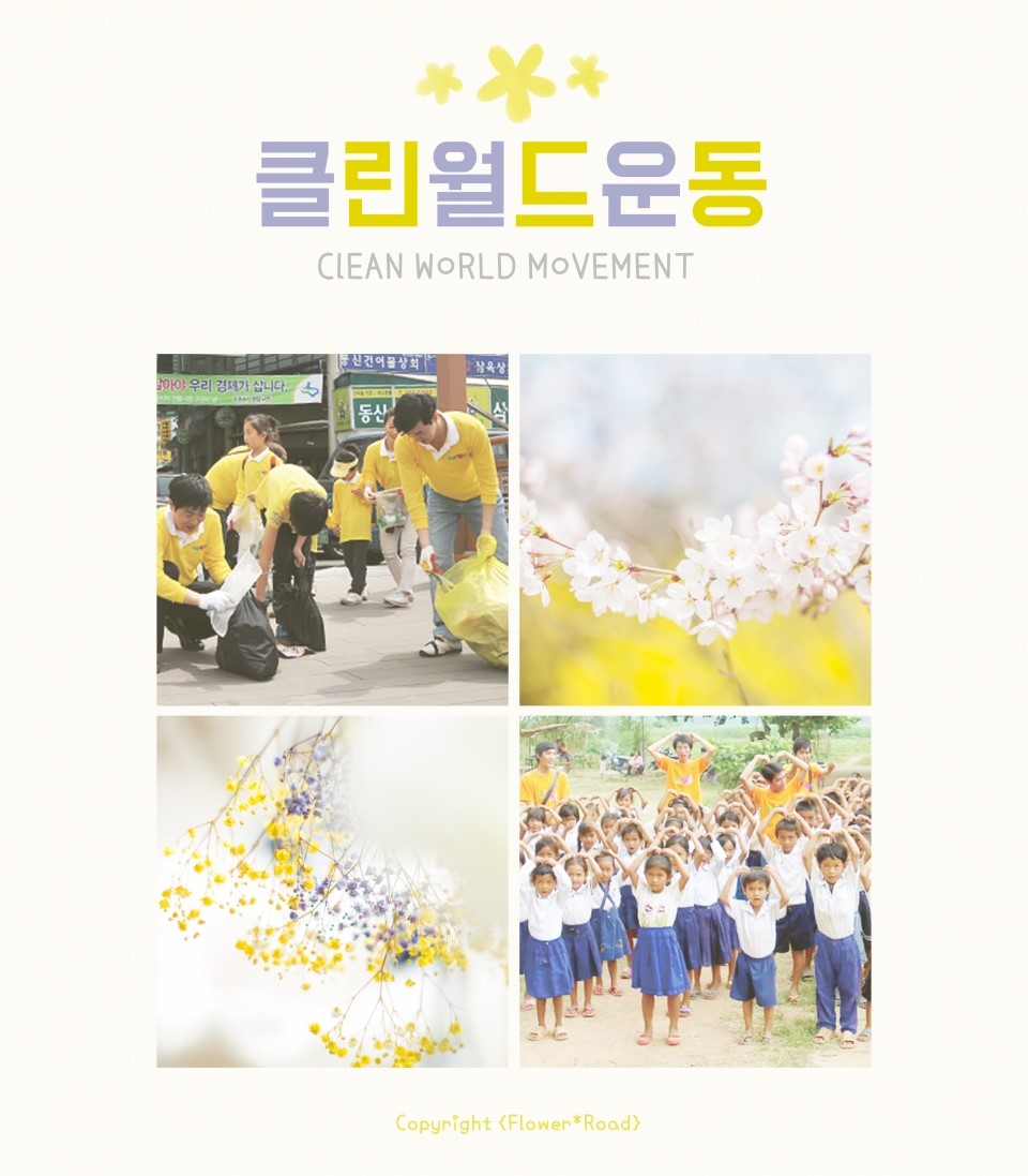 단순히 거리를 정화하는 활동으로 보이겠지만 클린월드운동은 아파하는 지구를 살리는 일에 앞장을 서는 가장 기본이 되며 동시에 가장 중요한 활동이라 할 수 있답니다.