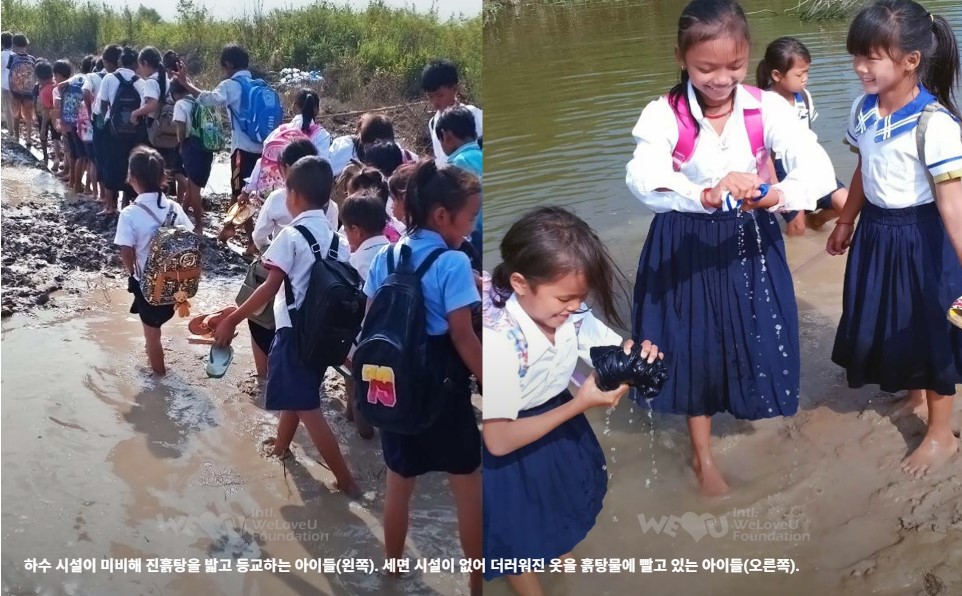 캄보디아 캄퐁치낭주 바리보르 지역은 홍수가 잦다. 하지만 하수 시설이 미비해 길 곳곳은 늘 진흙탕이고, 학생들은 발목까지 잠기는 흙탕물을 건너 학교에 간다.